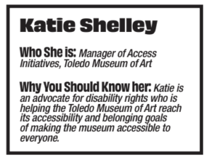 During Shelley’s first year at TMA, she conducted a physical audit of the museum’s buildings to see how the museum could be completely physically accessible. But On Monroe Street in Downtown Toledo, there’s a billboard for the Toledo Museum of Art that reads “Art brings Toledo together.” That’s where Katie Shelley, manager of access initia-