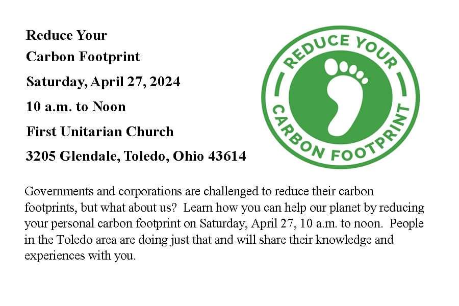 Learn about how you can create change by reducing your carbon emissions with a special “Reduce Your Carbon Footprint” event at First Unitarian Church, 3205 Glendale Ave., this Saturday from 10 am to 12 pm.