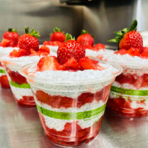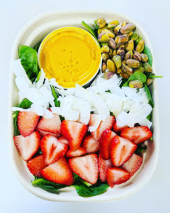 Her vegan and organic menu rotates weekly. A recent weeks’ offerings included Strawberry Pistachio Salad made with strawberries, pistachios, coconut and spinach with carrot ginger dressing — a powerful anti-inflammatory good for immune and gut support; Lentil, Curry, Kale, and White Bean Soup; and Chocolate Peanut Butter Ganache for dessert.