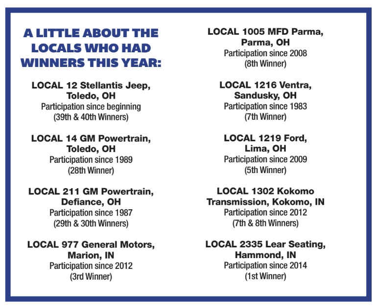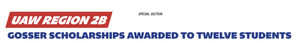 The Gosser Scholarship Awards Program, named in honor of the late UAW Vice President and Regional Director Richard T. Gosser, was established in 1962. This year, seven (7) Scholarships will be awarded in the name of Richard T. Gosser and one (1) Scholarship each will be awarded in the name of Ruthann Gosser-Harrison, Joseph Tomasi, Jack Sizemore, Lloyd Mahaffey and Ken Lortz.