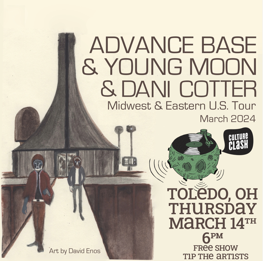 Advance Base and Young Moon are co-headlining their Midwest & Eastern U.S. Tour. Young Moon will be performing in many of these cities for the first time. Talented artist Dani Cotter is joining the two for their Toledo show.