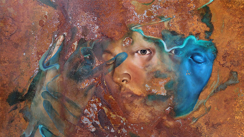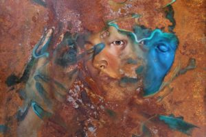 Crystalyn Hutchens won 2021’s NowOH Best in Show for her piece, Metamorphosis. For Ellen, this piece was a standout that caught her eye from the very beginning. A dual transformation takes place on the canvas and in the canvas material, a piece of discarded, rusted steel. The burnt orange of oxidized metal contrasted with the cool blue paint secured the selection of Ms. Hutchens’ work.