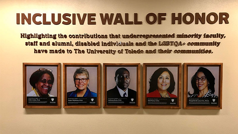 On April 8, five influential employees or exceptional alumni of the University of Toledo were inducted into the Inclusive Wall of Honor, displayed in University Hall and the student union buildings. The quintet were the inaugural recipients of this honor, celebrated virtually with displays in two locations. University and public health graduate student Kyndra Gaines created the concept on behalf of the Office of Diversity and Inclusion to provide more representation on campus, as well as give current students hope and encouragement.