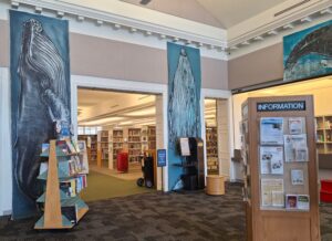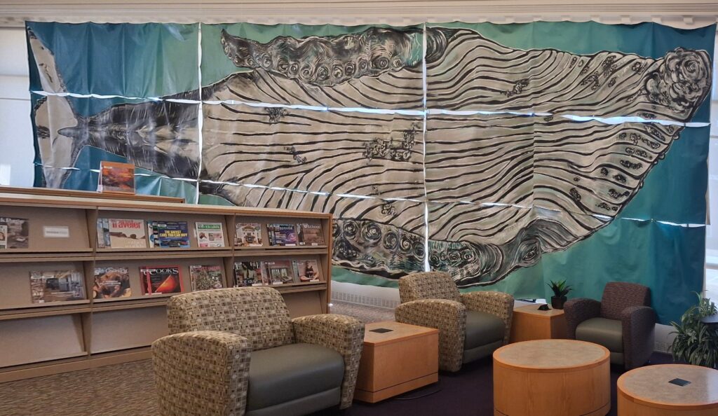 Robert said it was important in his installation to show viewers the most vulnerable part of the whale, its belly. “I want to have an experience. I want to have a shared experience. I want you to feel. I want you to know that I feel. That’s why I love showing at libraries and schools and colleges. What better place to be vulnerable than to be surrounded by books? Robert spoke highly of the collaboration between the Way Public Library and himself, likening it to that of a whale community. “It truly was a communal effort.”