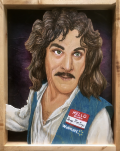 Along with his unique medium, Lamb’s illustrations are interesting, as pop culture, comedy and Lamb’s creative brain collide to make these whimsical pieces. “I enjoy taking subject matter from all different areas and references and bringing them together in places you wouldn’t normally expect, like, say, Inigo Montoya and Walmart. It seems funny to me. I’m trying to express myself and also trying to come up with things that people can see and understand.”