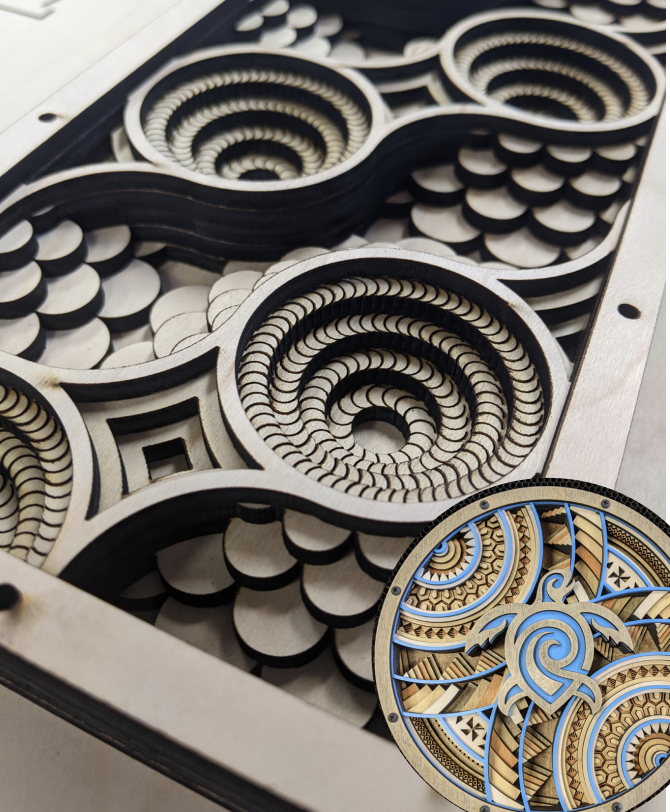When asked about his art Gardner said it has been a process, “I’ve explored a lot of styles, but my favorite are geometric shapes.” Gardner that stand out are the intricate and hypnotic wood carvings.“I have a love of patterns from history: middle east, Celtic, and even pacific island designs. I’m inspired by blending architectural precision with historic geometric design.” Even though he has an established style Gardner is looking to get more unorganized in his next phase, “Because I’m doing it for fun, and not a full time job anymore, I can be weirder and more creative.”