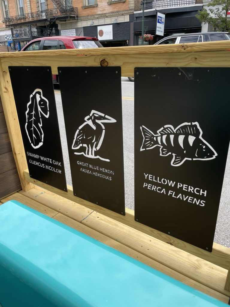But beyond utility, these parklets have other benefits. Kate Lochridge (a BGSU art and marine biology major) loves to spend time outside and has an interest in the ecology of her surroundings. She moved to Bowling Green in 2019 to attend school and developed an interest in the Great Black Swamp. Lochridge, hoping to foster an appreciation for the region’s natural history, created a winning design for an art-inspired parklet, or “artlet” in front of Novel Blends, an independent bookstore and coffee shop.