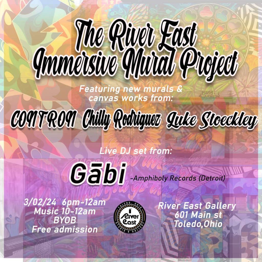 River East Gallery, an art gallery and studio space located in East Toledo was curated by artists Chilly Rodriguez, Con-Tron and Luke Stoeckley. Since its opening in 2022, the gallery has become a cornerstone for the Toledo art scene.