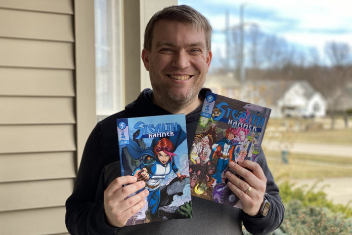 The inspiration for that first comic came from his wife’s nickname — “Stealth Hammer”— which she got while working as a graphic designer. As Ryan tells it, “She swooped in with a single submission for a concept for a client and the client chose it. Afterward her boss dubbed her Stealth. At another job, her boss said she was the one who had to lay the hammer down. The combined nicknames, Stealth Hammer, were a family joke as a cool superhero name.