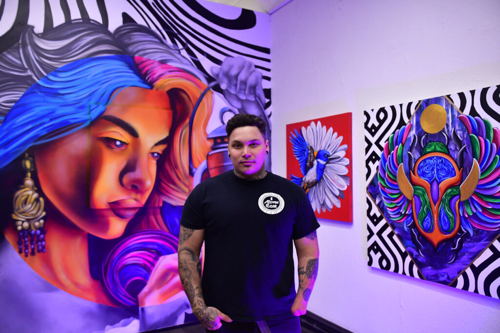 In the years since then, Rodriguez has focused on mural work. Along with Dean Davis, he worked on the new pedestrian bridge that crosses Main Street on the East Side. In January 2022, he opened the River East Gallery, which he co-owns along with local artists Con-Tron & Luke Stoeckley.