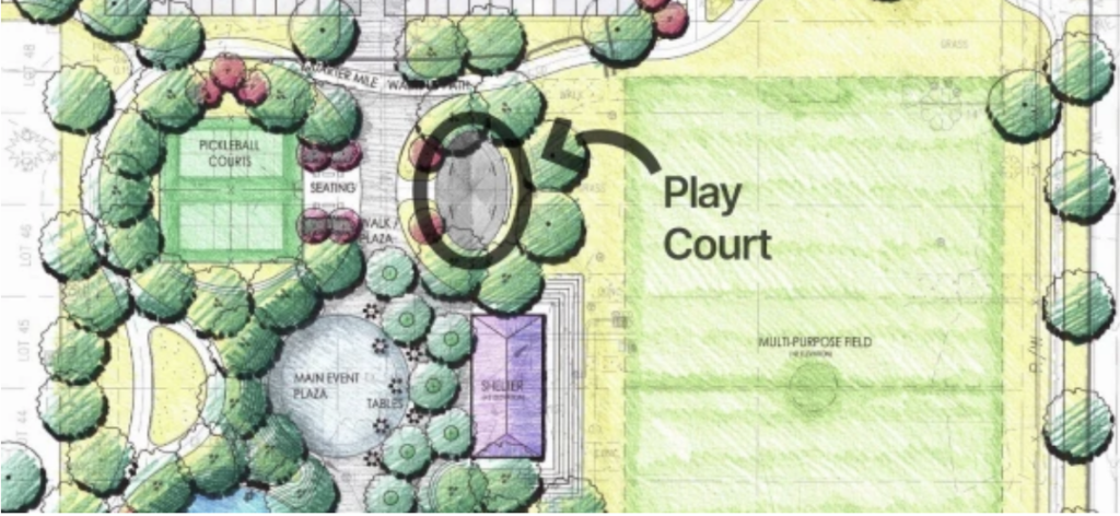 Inez Nash Park will be renovated to showcase the public art piece. Renovations will include a quarter-mile walkway, shelter, main event plaza, walkway system, plazas that connect the areas designed to encourage a variety of play and the site of the public art project: a shoot-around court with five hoops.