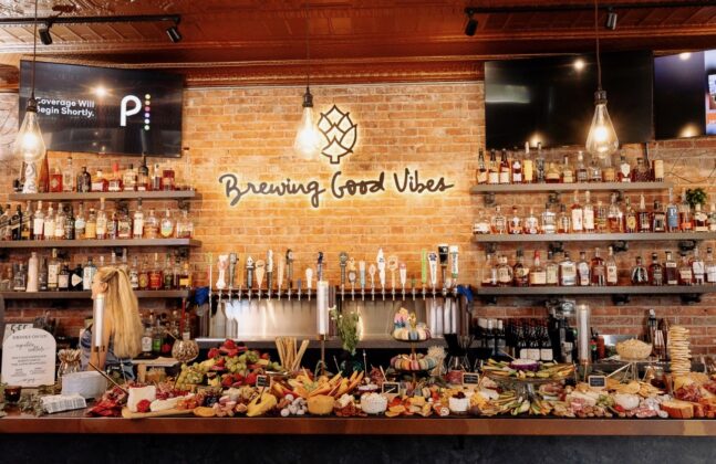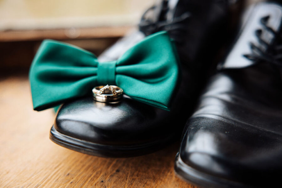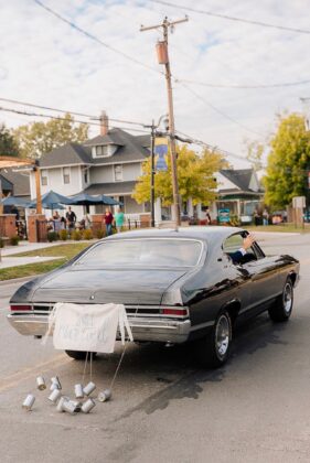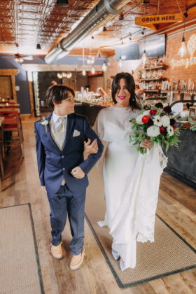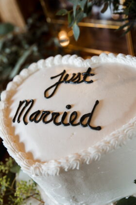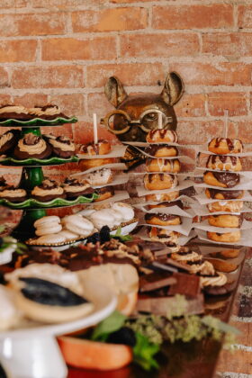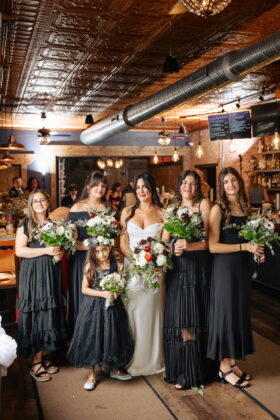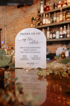 Describe your wedding style and inspiration: The design started with my blue statement shoes and evolved around the Taproom’s existing character. The space has a dark, retro feel with brick, brass and vintage charm, similar to an old brewery or cigar bar. I leaned into classic black-and-white elements, masculine details and timeless textures. Highlights included a cigar bar on the patio, vintage ashtrays, a muscle car getaway and an oversized charcuterie display.