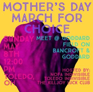 On Sunday, May 8 at Noon, the Mother’s Day March for Choice in Toledo, Ohio will be held at Goddard Rd. and Bancroft, 2801 Bancroft St., from noon to 2pm. The March is being organized by NOFA Indivisible, Toledo Indivisible, Toledo Abortion Center Escorts, Capital Care, Killjoy Luck Club and Toledo Persists.