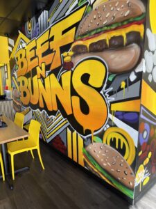 The interior of the restaurant features a large colorful mural painted by local muralist and artist “Chilly” Rodriguez, who brings his signature color and graffiti-style to Beef N Bunns, which opened in December of 2024.