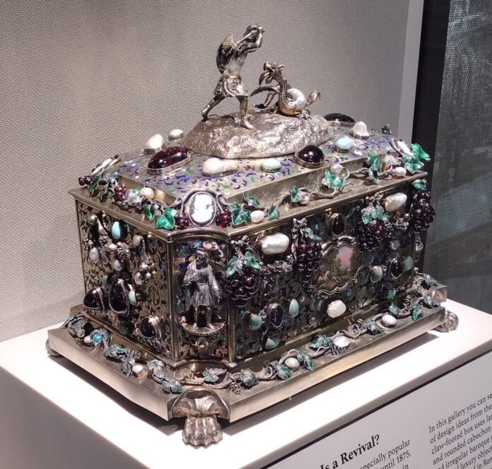 Along with necklaces and earrings, decorative bats, gem-covered book covers and lavish silver boxes fill the gallery space. These early pieces, collected by Lane after taking out a loan from a jeweler he was apprenticing under, are some of the oddest in the collection, and show off the broad scope of objects being presented.