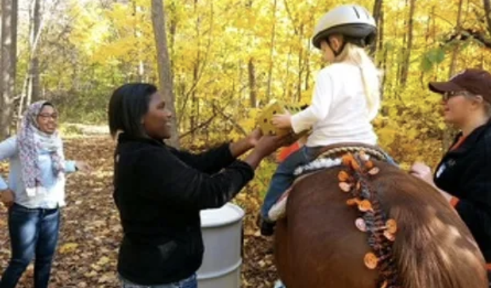 Children will ride on horseback through ten stations in the woods behind their facility’s barn, and do various “tricks,” like throwing a ball in a hoop, for a treat.